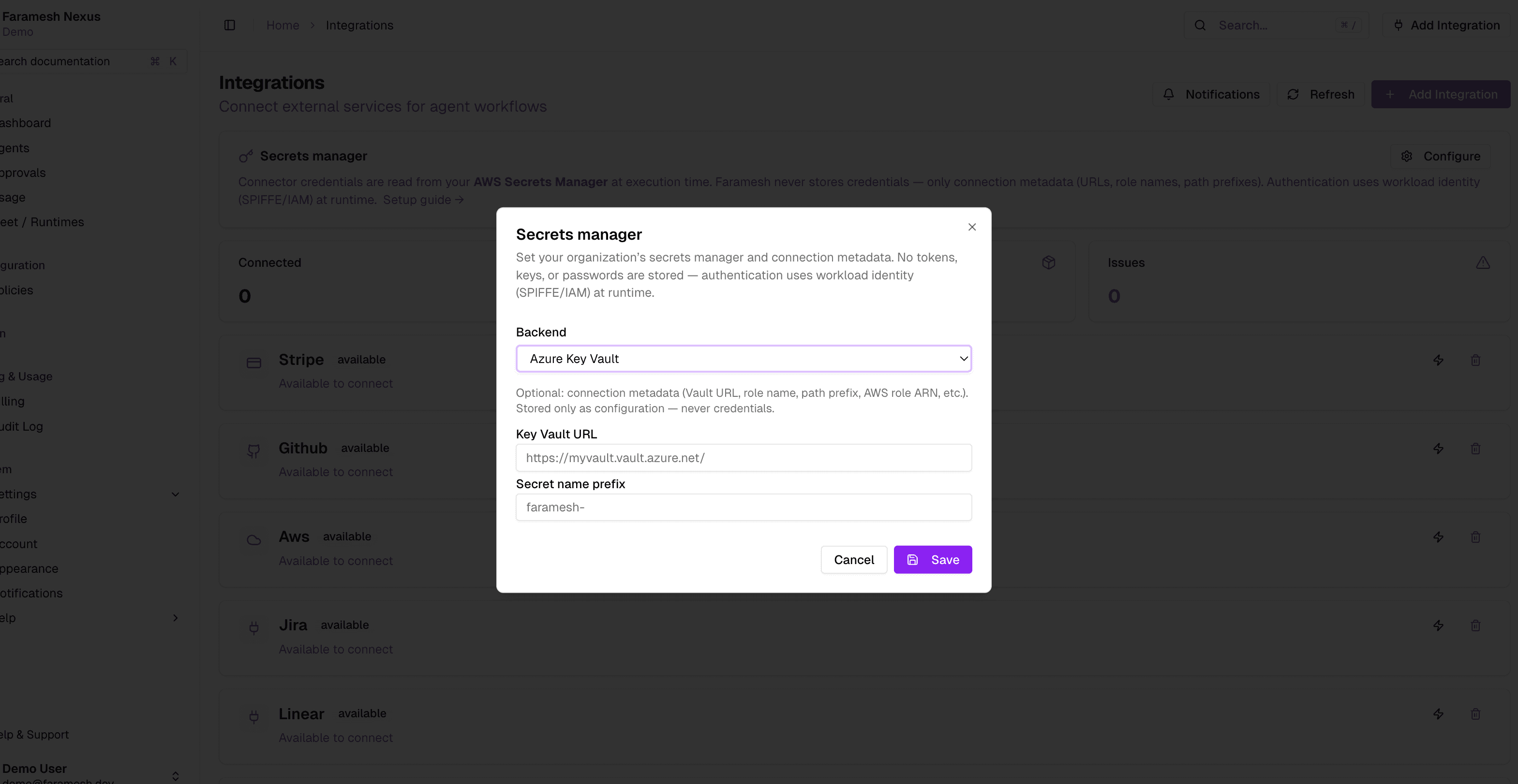 Your Vault instance, your network, your keys. Faramesh authenticates via JWT, not a static token.