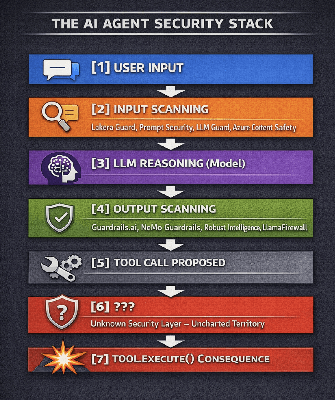 Every existing solution operates between layers 1 and 4. They try to catch bad inputs before the model sees them, or catch bad outputs before they become tool calls. They are doing real work. They are necessary. And they all share the same limitation: they can be bypassed.