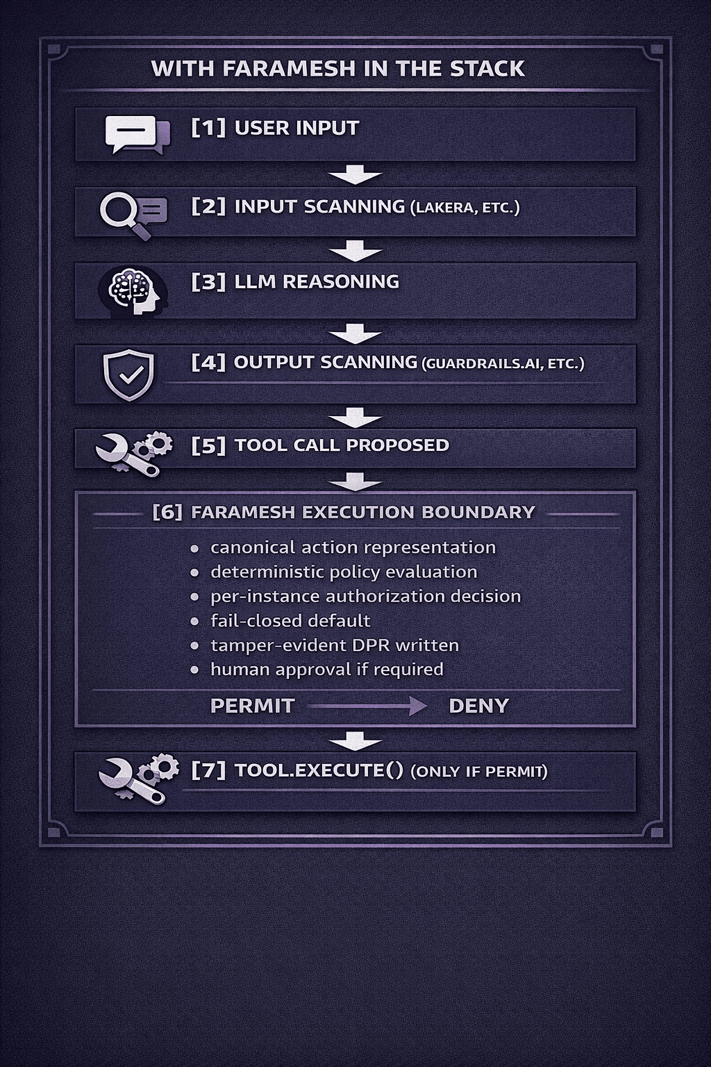 Faramesh sits at the execution boundary. Every tool call, every time, before anything executes.