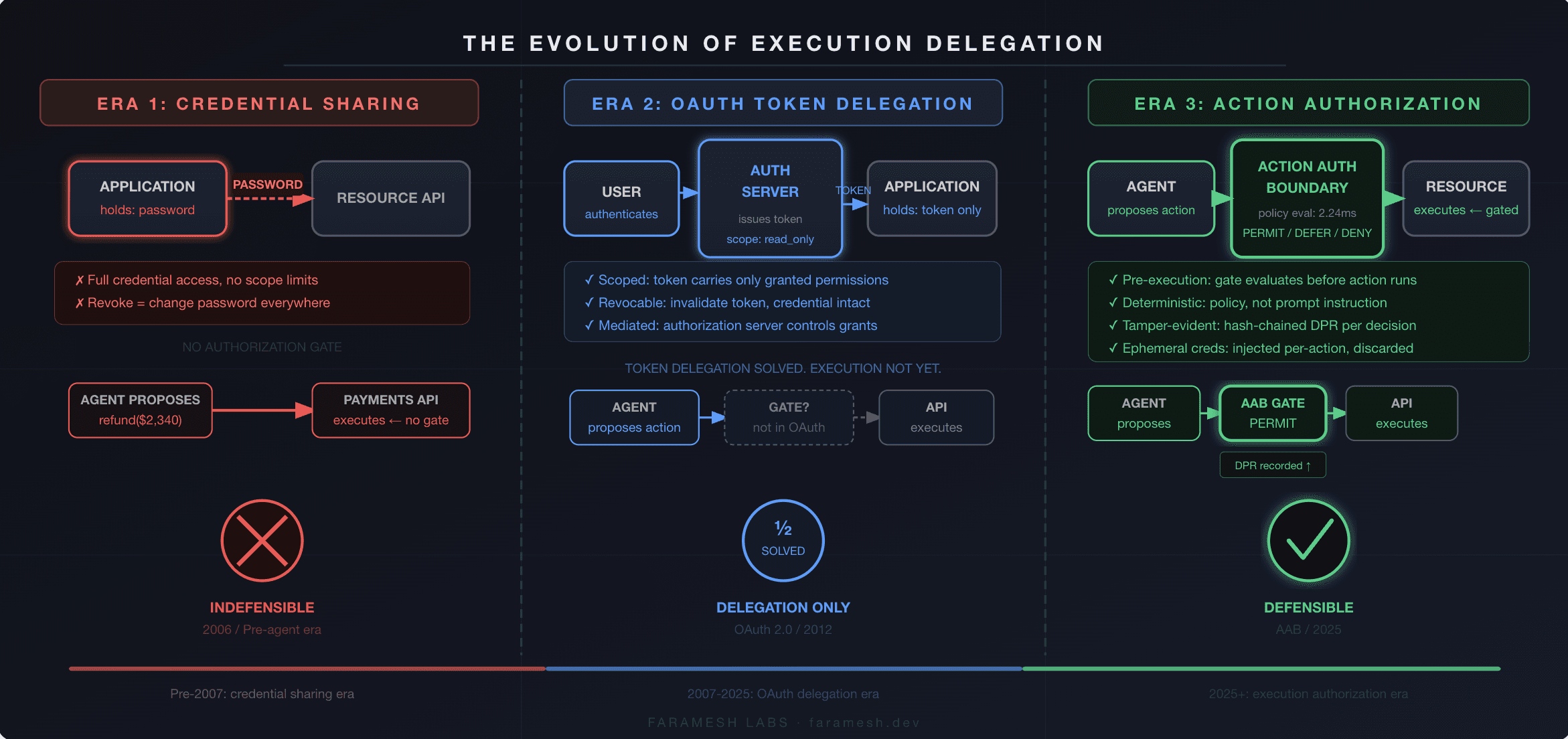 At the identity layer, OAuth established that credential sharing is not delegation. Delegation requires a mediating authority that issues scoped, revocable tokens tied to specific grants of access.