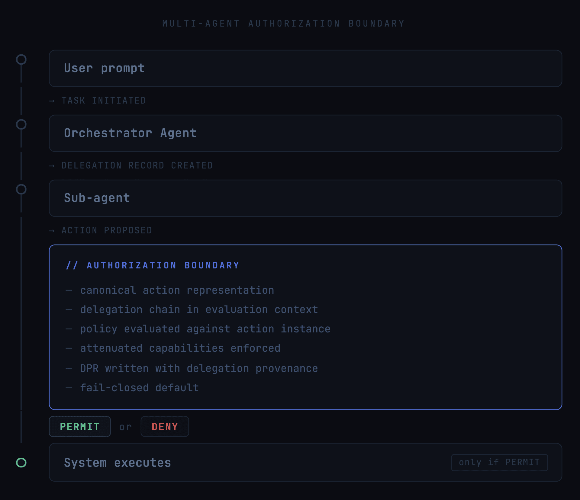 The delegation chain problem, knowing which agent authorized what across a multi-step orchestration is an extension of the core authorization architecture. Each step in the delegation chain produces an authorization event. The chain of events is the authorization record for the entire orchestration.