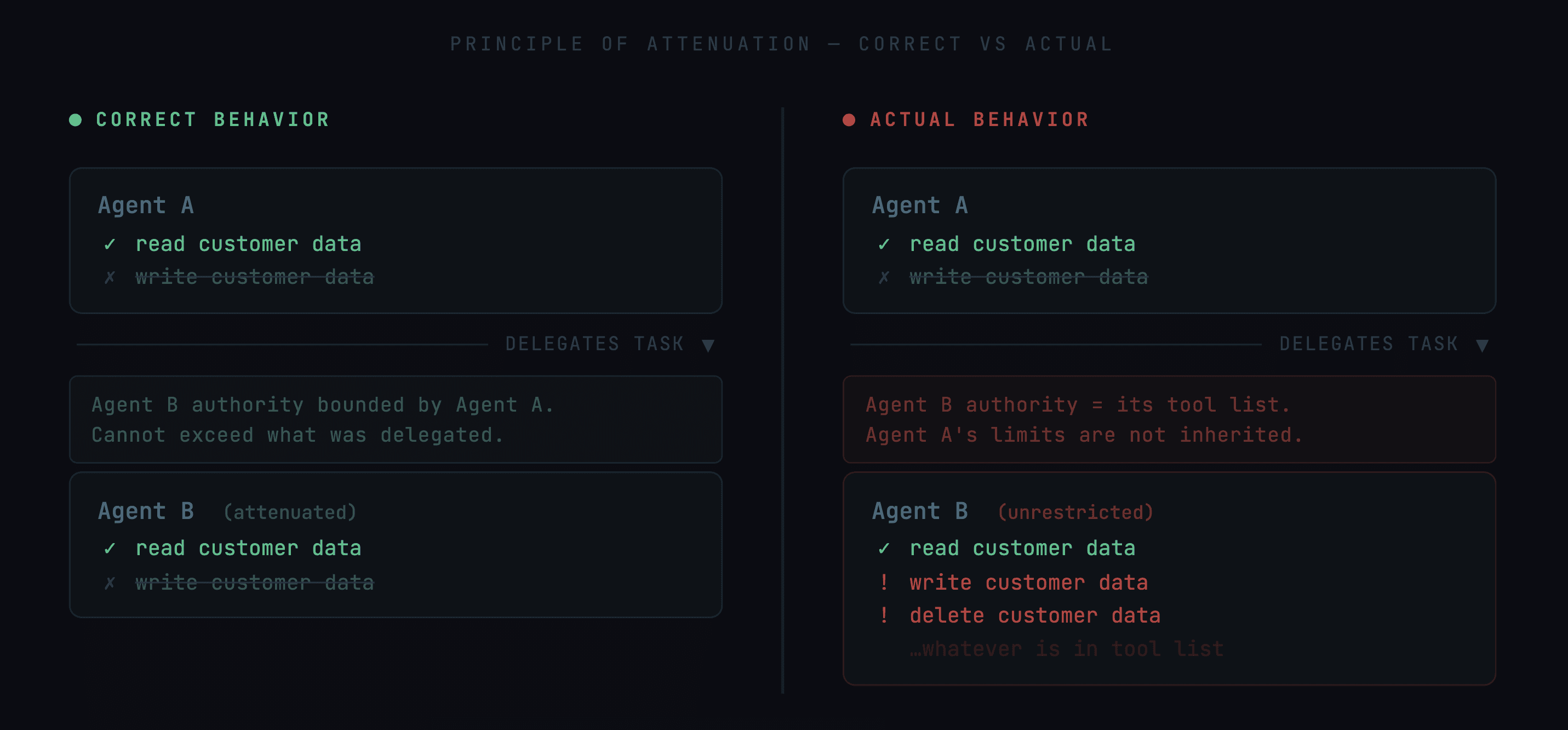 This principle - the principle of attenuation is well understood in security. It is completely unenforced in every multi-agent framework in common use. Agent B can do anything its tool list permits, regardless of whether Agent A that delegated to it had the authority to authorize those actions.