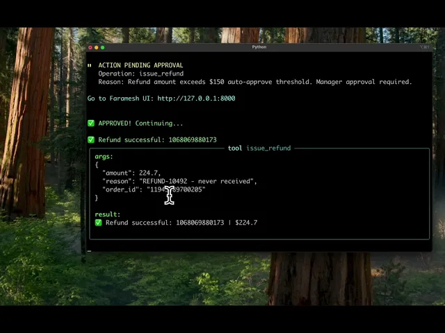 from faramesh.integrations.autogen import GovernedFunction # Wrap your function; calls go through Faramesh governed_refund = GovernedFunction(fn=refund_fn, agent_id="autogen-agent")